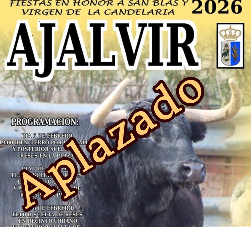 El Ayuntamiento de Ajalvir informa que se suspenden los festejos taurinos previstos para los días 6, 7 y 8 de febrero debido a las lluvias caídas, el mal estado del ruedo y las precipitaciones previstas para los próximos días.