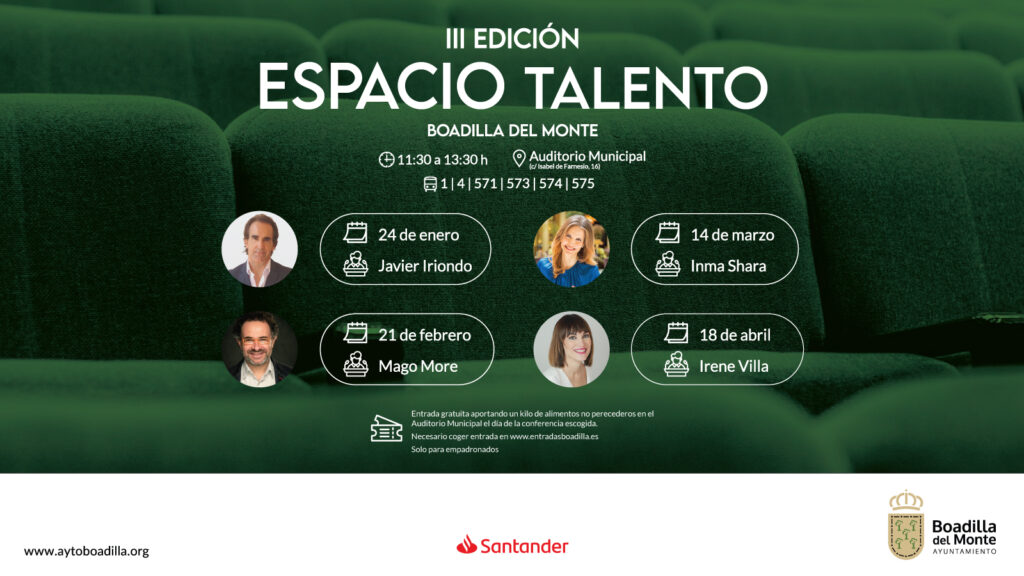 El próximo 24 de enero comenzará la tercera edición del ciclo Espacio Talento, organizada desde el Área de Innovación y Emprendimiento, en el que cuatro ponentes especializados en distintos ámbitos sociales exponen sus experiencias y aportan consejos para fomentar el talento, la motivación y la mejora personal.