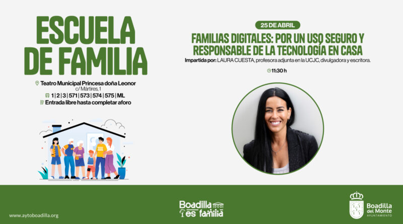 La Escuela de Familia de Boadilla del Monte ofrecerá el próximo sábado, 25, a las 11:30 horas, la charla Familias digitales: por un uso seguro y responsable de la tecnología en casa, a cargo de Laura Cuesta, profesora adjunta en la UCJC, divulgadora y escritora.