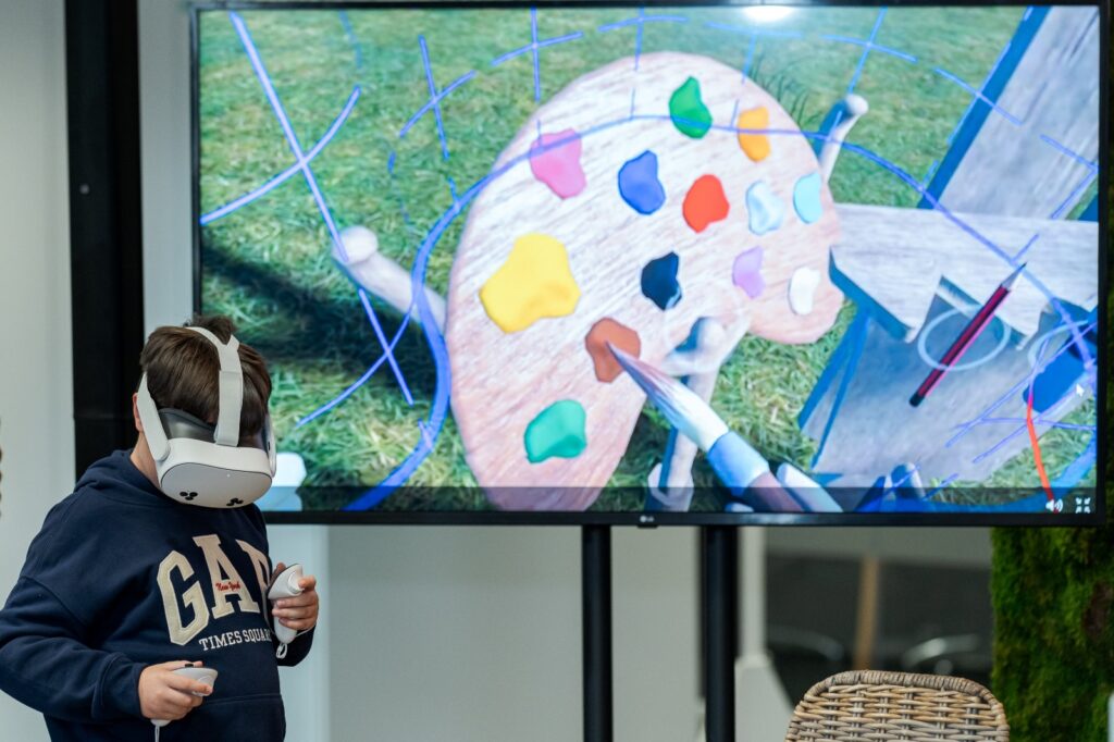 Gracias al acuerdo entre Las Rozas Innova y AVA, los niños y jóvenes atendidos podrán realizar durante todo este curso distintas sesiones con gafas de realidad virtual y el software Therafycare. Este software, desarrollado por Meta, está especialmente diseñado para personas con trastornos del neurodesarrollo, que permite a los niños realizar acciones como trasladarse virtualmente a la calle para aprender a cruzar de forma segura y controlada o, por ejemplo, convertirse en pintores utilizando pinceles virtuales o sus propias manos, según sus capacidades, para estimular su creatividad y mejorar su coordinación motora.