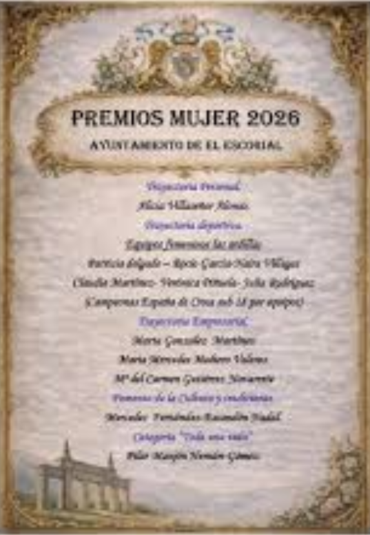 La concejalía de Igualdad del Ayuntamiento de El Escorial organiza la entrega de los Premios Mujer 2026 coincidiendo con el Día Internacional de la Mujer el próximo 8 de marzo. Se trata de una iniciativa para reconocer la figura de la mujer en diversos ámbitos por su trayectoria y por su implicación con nuestro municipio.