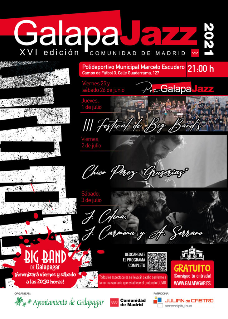 Regresa a Galapagar su archiconocido   festival musical Galapajazz . En su XVI edición el evento   jazzístico   más importante del noroeste de Madrid cambia su formato, ya que esta vez se realizará al aire libre, más concretamente en Polideportivo Municipal Marcelo Escudero. Aunque la entrada será libre, es obligatorio obtenerla  y para ello el consistorio pone a disposición de los interesados la página Flowte creada específicamente para la reserva de entradas para los eventos organizados por el Ayuntamiento de galapagueño.